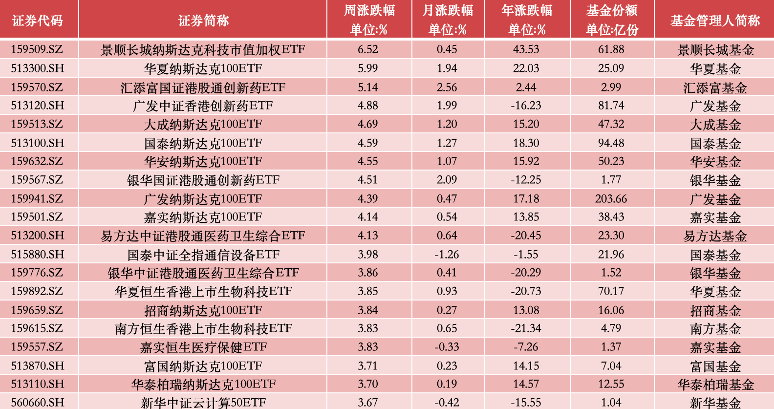 具体来看,周涨幅最大的是纳指科技ETF(159509),周涨幅达6.52%。此外,纳斯达克ETF(513300)周涨幅也接近6%,排名第二。而在涨幅榜排名前20位的产品中,有多达10只产品跟踪纳斯达克指数。