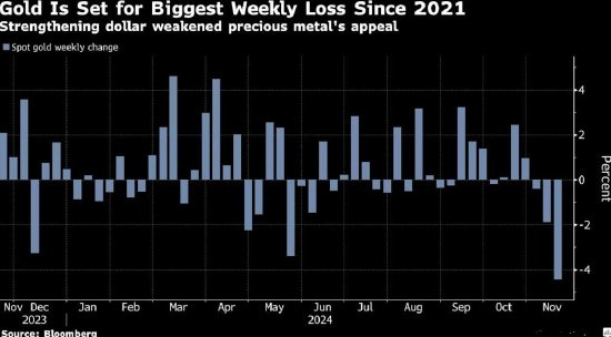 金价已从10月31日的历史高点下跌了约8%,在特朗普上周赢得白宫大选后,跌势进一步加剧。而美元则升至两年来的高点,原因是人们预期,在特朗普担任总统期间,经济增长和(5.448, 0.00, 0.00%)企业利润将会走高。美元走强使得以美元计价的大宗商品对大多数买家来说更加昂贵。