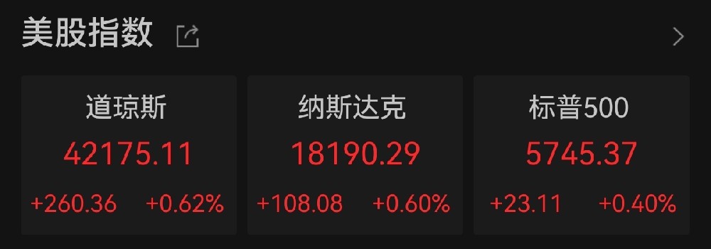 美东时间周四,美股三大指数集体收高。截至收盘,道指涨260.36点,涨幅为0.62%,报42175.11点;纳指涨108.09点,涨幅为0.60%,报18190.29点;标普500指数涨23.11点,涨幅为0.40%,报5745.37点。