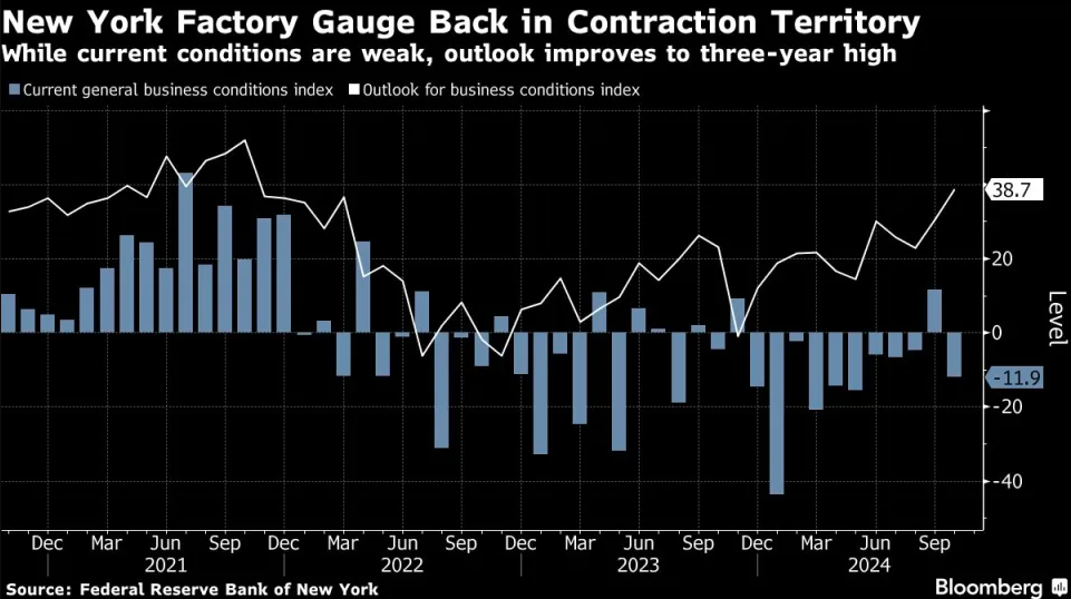 令市场人士尤为对该份数据表现感到惊讶的,其实还是与上月数据的对比——9月纽约联储制造业指数曾达到11.5,这是30个月来最高水平。然而,仅仅一个月后,这项数据便又直坠了23.4点,单月波动之大令人瞠目结舌。